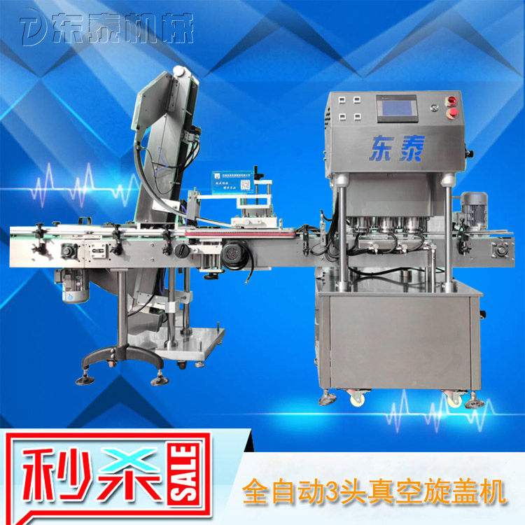 該直線式真空旋蓋機是東泰機械結(jié)合用戶使用的情況,摒棄了傳統(tǒng)轉(zhuǎn)盤式真空旋蓋機的弊端,研制開發(fā)的新型高效設備,設備自動檢測到兩個瓶子蓋子進入到雙頭真空旋蓋機內(nèi),旋蓋機彩色顯示屏會實時顯現(xiàn)旋蓋狀況,整機多點檢測,當進口無瓶無蓋、出口堵塞、定位不準、瓶身傾倒均自動停機。單個旋蓋頭達到的真空度都可以單顯示,單調(diào)整