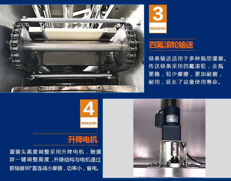 3.灌裝頭高度調(diào)整采用升降電機(jī),觸摸屏一鍵調(diào)整高度,升降結(jié)構(gòu)與泵通過(guò)聯(lián)軸器90°直連減小摩擦,功率小,省電;