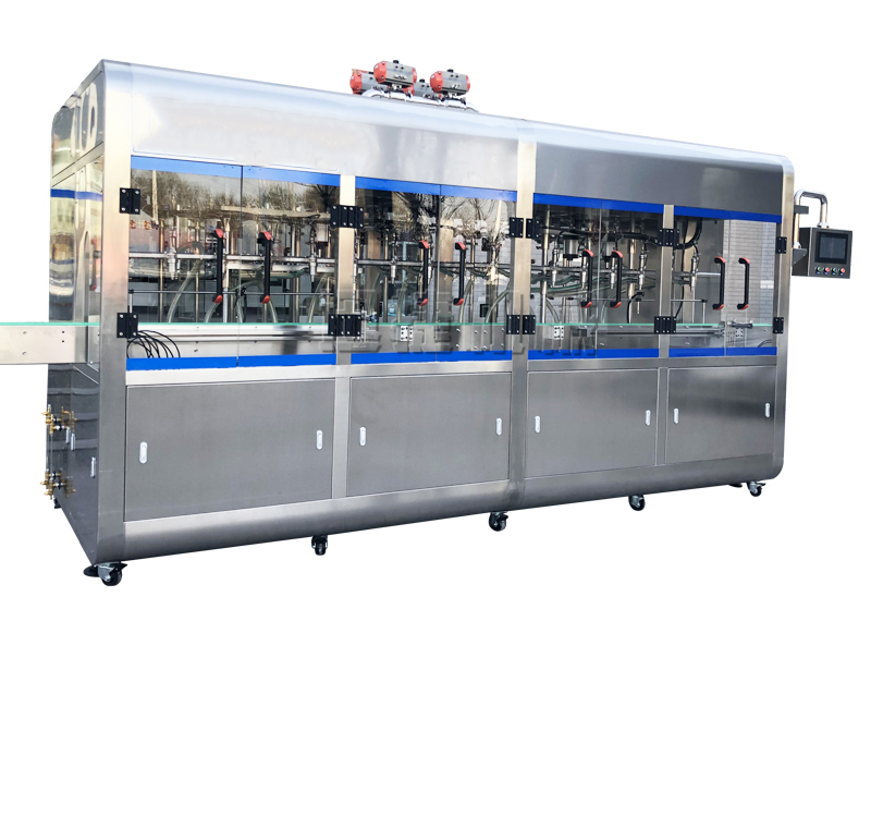 灌裝機儲油箱部分與灌裝機連接法蘭保持原位置,避免沖洗,避免雜質進入;儲油箱容積≥600KG,內部設有阻擋板,避免油品輸入過程油品外冒,同時保證灌裝精度;儲油箱位置設在灌裝機頂部,自帶可視液位計,頂部箱蓋大包圍設計并且可以打開,具備排氣功能(排出氣泡等);灌裝頭整體上升方式平穩,不產生震動,高度及寬度可調。