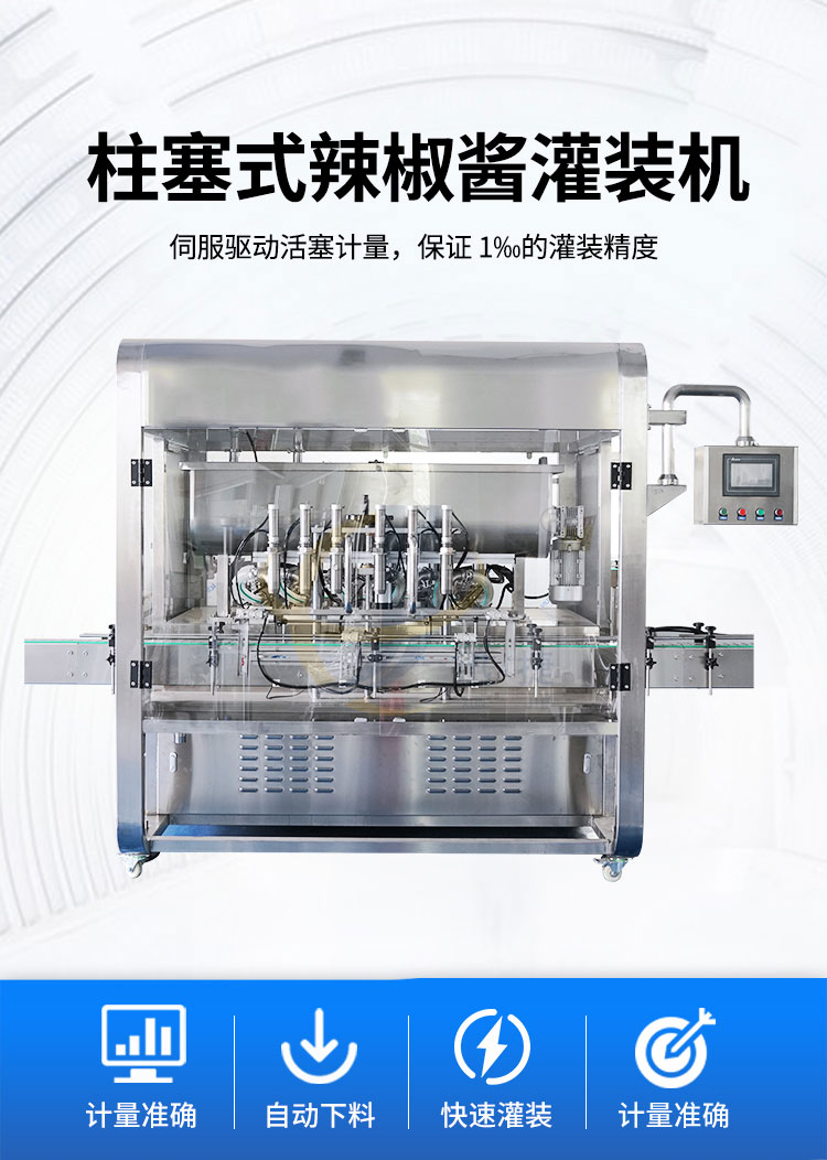 辣椒醬灌裝機采用活塞式灌裝原理,適用于調味品中帶顆粒并且濃度較大的辣椒醬、豆瓣醬、花生醬、香菇醬、果醬、牛油火鍋底料。