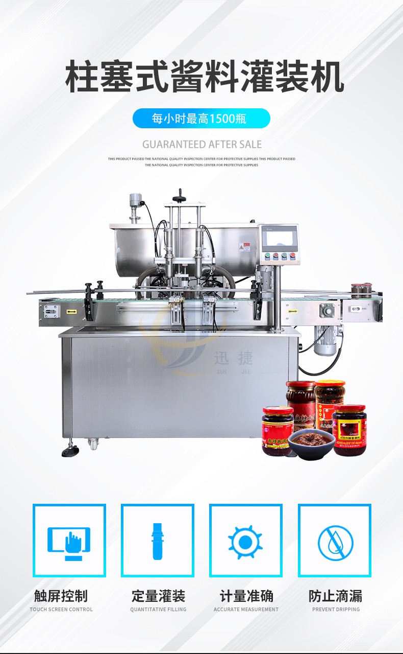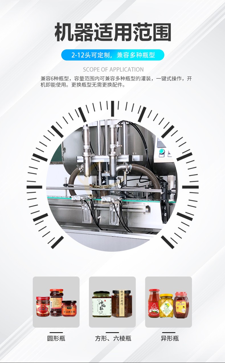 全自動雙頭醬料灌裝機兼容6種瓶型,容量范圍內可兼容多種瓶型的灌裝,一鍵式操作,開機即能使用。更換瓶型無需更換配件。