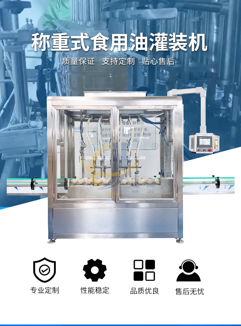 全自動(dòng)食用油灌裝機(jī)適用于玻璃瓶、PET瓶、PP桶都可以灌裝。包裝規(guī)格:500ml、900ml1.6L、4L、5L、8L、10L、18L。