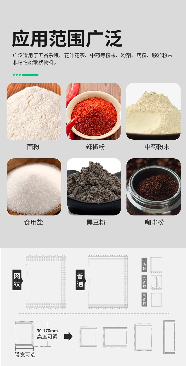 粉劑包裝機(jī)比較適用于豆奶粉、辣椒粉、奶粉、咖啡面粉、面粉等物品的計(jì)量包裝。與此同時(shí)還可以包裝淀粉、奶粉、食用鹽、中藥粉末、調(diào)味品、黑豆粉、預(yù)混料、飼料、酶制劑等。粉劑包裝機(jī)包裝材料:BOPP薄膜、紙/聚乙烯、玻璃紙/聚乙烯、聚酯/鍍鋁/聚乙烯、聚酯/聚乙烯、茶葉濾紙等可熱封復(fù)合包裝材料。