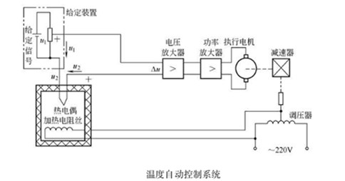 如果將控溫過程中的人工操作 (檢測和調(diào)節(jié)) 換由自動控制裝置完成,則成為包裝機自動控溫系統(tǒng)。如下圖所示,檢測元件熱電偶檢測恒溫箱內(nèi)的溫度,并將溫度轉(zhuǎn)換為對應(yīng)的電壓信號2 ,同時反饋給比較器。比較器比較表示給定溫度的給定電壓信號1與檢測電壓信號2的大小,得到溫差信號,其大小和正負(fù)代表溫差的大小和方向。溫差信號△經(jīng)電壓放大和功率放大后,控制執(zhí)行電機的轉(zhuǎn)速和方向,執(zhí)行電機通過傳動裝置拖動調(diào)壓器觸頭調(diào)節(jié)供熱電壓。當(dāng)溫度偏高時,動觸頭向著減小電壓( 電流)方向轉(zhuǎn)動; 反之,當(dāng)溫度偏低時,動觸頭則向著增大電壓( 電流)方向運動,直至恒溫箱內(nèi)溫度達(dá)到給定溫度,溫差信號△=0 時觸頭停止運動。