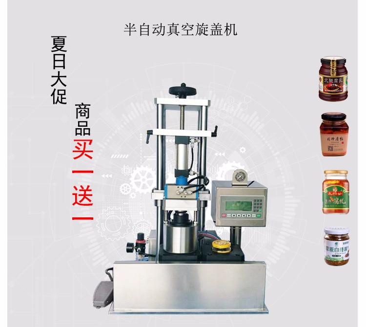 這款小型辣椒醬封口機主要用于食品包裝,采用標(biāo)準(zhǔn)馬口鐵爪式旋開蓋封口的玻璃瓶包裝。可實現(xiàn)的功能是抽吸包裝容器內(nèi)的空氣使其達(dá)到設(shè)定的負(fù)壓值(即抽真空),然后旋緊蓋子。 為半自動機型,即人工進(jìn)出瓶,人工配蓋,其他過程自動。