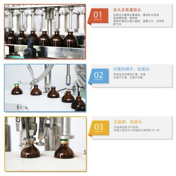 2. 穩(wěn)定精準(zhǔn)快速:柱塞式計(jì)量泵定量灌裝,灌裝針頭設(shè)有防滴漏裝置,精度高。每分鐘可灌裝40-60瓶。